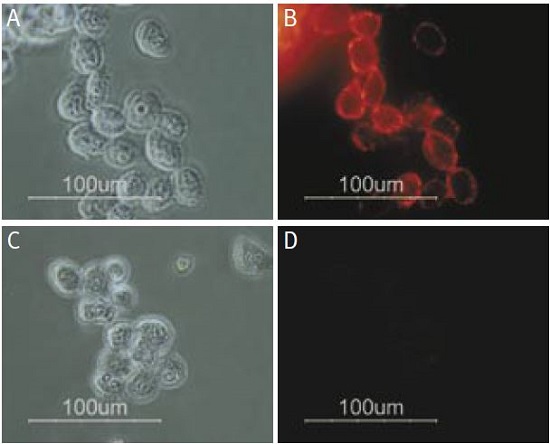 Staining of human melanoma cells A875 with Anti-p75 NGF Receptor (extracellular) Antibody (#ANT-007). Cells were incubated with Anti-p75 NGF Receptor (extracellular) Antibody (I:200) (A and B) or with Anti-p75 NGF Receptor (extracellular) Antibody preincubated with the negative control antigen (C and D), followed by goat anti-rabbit-Alexa Fluor 555 (Red), (x100).