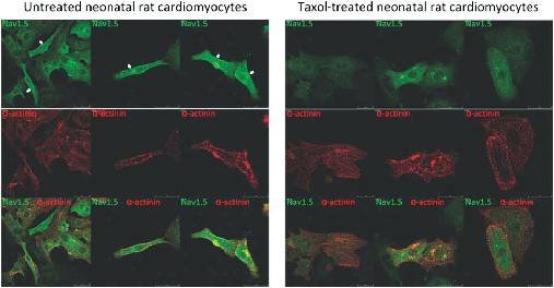 Immunocytochemical staining of neonatal rat cardiomyocytes (NRCs) using Anti-NaV1.5 (SCN5A) (493-511) Antibody (#ASC-005). Untreated cardiomyocytes (left) show NaV1.5 staining (green) in the cytoplasm and the membrane surface. Following taxol treatment, less NaV1.5 staining is observed and the channel is mostly localized to the cytoplasm.