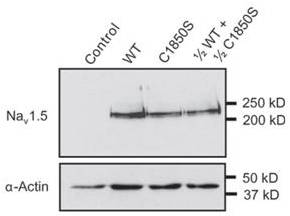 Brugada syndrome (BrS), a rare clinical cardiac disorder characterized by an abnormal rise of the ST-segment in an ECG scan, usually unmasked by Na+ channel blockers20, is an arrhythmical disorder with episodes of ventricular fibrillation, which significantly elevates the risk of sudden cardiac death and sudden infant death syndrome14,15,20, albeit without structural heart disease. Although more than 90 mutations leading to BrS have been mapped to NaV1.5, the majority of which reduce INa either by alternations of its membrane expression density or its biophysical properties, only about 20% of the patients carry a mutation in the gene encoding it. In an effort to map causative factors of this elusive morbidity, Petitprez et al.20 investigated a novel BrS mutation, C1850S, which they identified by a molecular screening of SCN5A in a patient suffering from phenotypical BrS. Following a transfection of HEK293 cells with WT and mutant DNA, results of immunoblots using Anti-NaV1.5 (SCN5A) (493-511) Antibody (#ASC-005) showed similar levels of protein expression between WT and mutant strands (Figure 1), confirming the hypothesis that the mutation does not alter the channel’s membrane density, but rather, as was evident by electrophysiological experiments, reduces the peak of INa, its intermediate-density and the time it takes to inactivate20.
