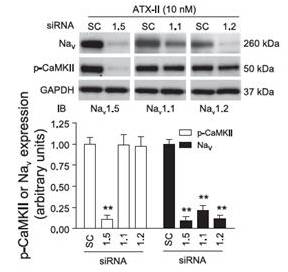 The decrease in NaV1.5 protein levels by siRNA reduces ATX-II-induced phosphorylation of CaMKII. NaV1.5 levels were monitored by using Anti-NaV1.5 (SCN5A) (493-511) Antibody (#ASC-005). Alomone Labs ATX-II (#STA-700) was used to activate NaV1.5 channels.