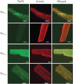 Although NaV1.5 is the major voltage-gated Na+ channel isoform expressed in the heart, designated neuronal type NaV channels, namely NaV1.1, NaV1.3 and NaV1.6 have also been detected in the mammalian heart and contribute 10-20% of the Na+ current peaks in cardiomyocytes and Purkinje cells31. In a study, their contribution to heart failure was investigated. Using a combination of electrophysiological measurements and immunological staining using Alomone Labs Anti-SCN1A (NaV1.1) Antibody (#ASC-001), Anti-SCN3A (NaV1.3) Antibody (#ASC- 004), Anti-NaV1.5 (SCN5A) (493-511) Antibody (#ASC-005) and Anti-NaV1.6 (SCN8A) Antibody (#ASC-009), the results indicate that most NaV isoforms are expressed in cardiac ventricular myocytes (Figure 2), and that upon pressure overload induction (i.e. heart failure), there is an increase in TTX-sensitive currents, namely those of NaV1.1, NaV1.3 and NaV1.6 channels. This is reflected by an increase in the expression of NaV1.1 and NaV1.6 and a decrease of NaV1.5 channels31.