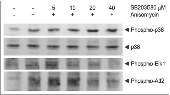 SB203580 (#S-370) inhibits the phosphorylation of Elk1 and Atf2 caused by p38 MAPK. 3T3-L1 cells were grown to 70% confluence and then serum starved for 3 h. The cells were incubated for 2 h with various concentrations of SB203580 and stimulated with 5μM Anisomycin (#A-520). The cell proteins were resolved by SDS PAGE, probed with antiphospho-p38 MAPK, anti-p38 MAPK, anti-phospho-Elk1 and anti-phospho-Atf2. The phophorylation of Elk1 and Atf2 was reduced as a function of SB203580 concentration.