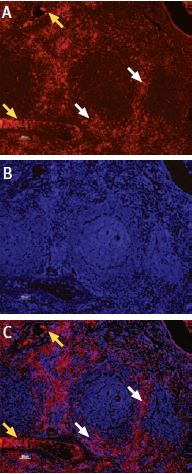 Immunohistochemical staining of KCa3.1 with Anti-KCNN4 (KCa3.1, SK4) Antibody (#APC-064) in rat spleen. (A) and (C) Secondary (activated) follicle in the spleen white pulp showing intense staining of Marginal Zone and Periarteriolar T-lymphocytes (white and yellow arrows, respectively); note that cells in the red pulp and B lymphocytes in the germinal center are not stained. (B) The counterstain is Hoechst 33324.