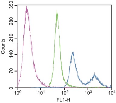 Human Jurkat cells (a T cell leukemia line) were either left untreated or treated with 1mg/ml phytohemagglutinin A (PHA) for 24 hours. Surface expression of the KV1.3 channel was studied using an Anti-KV1.3 (KCNA3) (extracellular)-FITC Antibody (#APC-101-F) directly labeled with the fluorophore FITC and analyzed in a flow cytometer. Untreated and unstained cells are shown in violet. Untreated cells stained with the antibody are shown in green while PHA- treated stained cells are shown in blue. Note that PHA-treated cells show a marked surface upregulation of the KV1.3 channel.