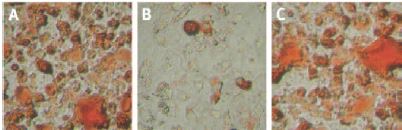 FK-506 (#F-900) inhibits the antiadipogenic activity of calcineurin. 3T3-L1 preadipocytes were induced to undergo adipocyte differentiation with 1μg/ml insulin for 4 days (A, B and C). As indicated cells were additionally treated for the first 4 days of differentiation with 1 μM Ionomycin (#I-700) (B and C) in presence (C) or absence (A and B) of 5 ng/ml FK-506. After 10 days the cells stained with Oil Red O and visualized with light microscopy. A.