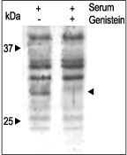 Genistein (#G-300) inhibits the Tyrosine phosphorylation of 28 kDa protein. Hela cells were grown to 70% confluency, and the cells serum starved for 18 h. The cells were preincubated for 30 min in presence or absence of 500 nM Genistein and simulated for 2 h with or without 20% fetal calf serum. The cell extracts were analyzed by Western blotting by probing with phospho-Tyr specific antibodies.