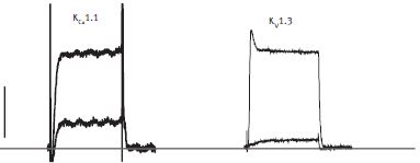 The effect of 100 nM Charybdotoxin (#STC-325) on KV1.1 (left) and KV1.3 (right, coexpressed with KVβ1.1) channels, expressed in Xenopus oocytes. In both cases the currents were recorded with standard ND96 solution (see above), Membrane holding potential was –100 mV, stepped every 15 s. to +20 mV for 100 ms. The vertical bar represents 0.1 and 3 μA for KCa1.1 and KV1.3 respectively.