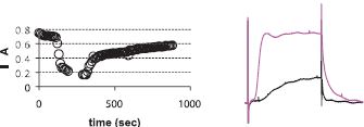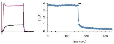 Inhibition of heterologously expressed KV1.3 channels by 10 nM of Margatoxin (#STM-325). Left: time course of current amplitude change, upon application of toxin. Currents were recorded with extracellular ND96 solution and were elicited every 10 seconds by 100 ms pulse to 0 mV (holding potential was –100 mV). The bar represents period of toxin perfusion. Right: superimposed traces before (violet) and during (black) application of 10 nM Margatoxin.