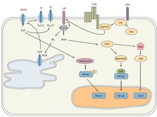 The principal signaling pathway following TCR engagement is protein tyrosine phosphorylation. The tyrosine phosphorylation cascade will ultimately activate several transcription factors such as NF-AT and AP-1 which in turn direct the transcription of the new genes needed for T cell response.