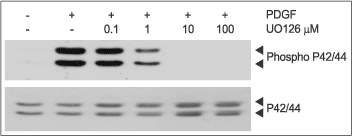 U0126 (#U-400) inhibits P42/44 MAPK phosphorylation. C6 glioma cells were grown to 70% confl uence and then serum starved for 1.5 h. The cells were then incubated for 2 h with various concentrations of U0126 as indicated in the picture and stimulated with or without 7ng/ml PDGFAA. The cell proteins were resolved by SDS PAGE, probed with anti phospho-P42/44 MAPK (upper panel) or with anti P42/44 MAPK (lower panel). The inhibition of P42/44 MAPK phosphorylation by U0126 increased respectively with the increase in U0126 concentration.