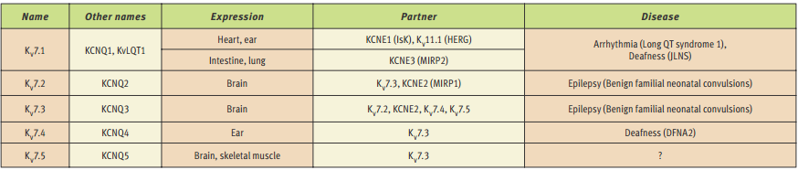 K+ channels are probably the most diverse class of ion channels with over 70 human genes described to date. Within the K+ channels the voltage-sensitive class is the most heterogeneous with at least 6 identified subfamilies of genes. The voltage-gated K+ channels have several key functions in both excitable and non-excitable cells and indeed, several genetic diseases have been ascribed to mutations in these channels. Surprisingly, many of the mutations in KV channels causing disease seem to converge in one particular family: The KV7 subfamily in which, four out of five members have been linked to channelopathies (genetic diseases caused by ion channel malfunction) (see Table 1).