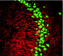 Immunofluorescence staining of P2X7 using Anti-P2X7 Receptor Antibody (#APR-004) in rat hippocampus (CA2-CA3), visualized by confocal microscopy. P2X7 (red) and NeuN (green).