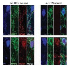 A) High magnification images showing triple immunofluorescent labeling for parvalbumin (blue), MAP2 (green), and HCN2 (red) in Hcn2+/+ (left panel) and Hcn2-/- (right panel) in RTN neurons using Anti-HCN2 antibody (#APC-030). B) Immunostaining with Anti-HCN4 antibody (#APC-052) shows prominent labeling in both Hcn2+/+ and Hcn2-/- RTN neurons. Neither HCN2 nor HCN4 overlap with MAP2. Scale bars, 5 μm.