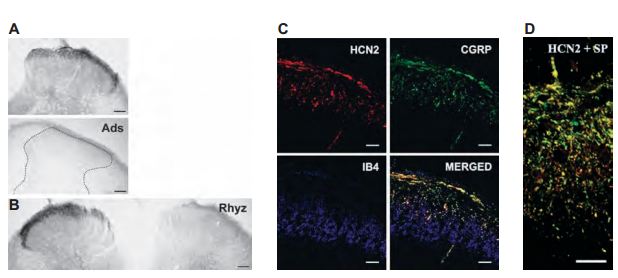 HCN channels are abunddantly expressed in DRGs. A study was initiated to see whether HCN2 is localized in the DRG soma or whether it is transported from the soma to the central axons of the DRG neurons that terminate in the spinal dorsal horn4 (Figure 7). HCN2 was located in primary sensory neurons in the superficial spinal dorsal horn of rats, more specifically in laminae I and outer laminae II (Figure 7A). Furthermore, dorsal rhyzotomy completely abolished the immunoreactivity of HCN2 (Figure 7B), strongly suggesting that HCN2 is confined to axon terminals of nociceptive primary afferents. To further expand this notion, HCN2 was found to colocalize with CGRP, a neuropeptide expressed by peptidergic nociceptive primary afferents (Figure 7C). Having gained insight on the localization of HCN2 in nociceptive primary afferents, a subsequent study was done to investigate the functional significance of HCN2 in nociceptive primary afferents36. HCN2 colocalized with Substance P (SP), suggesting that HCN2 may be involved in pain transmission from SPcontaining nociceptive primary afferents to spinal neurons (Figure 7D).