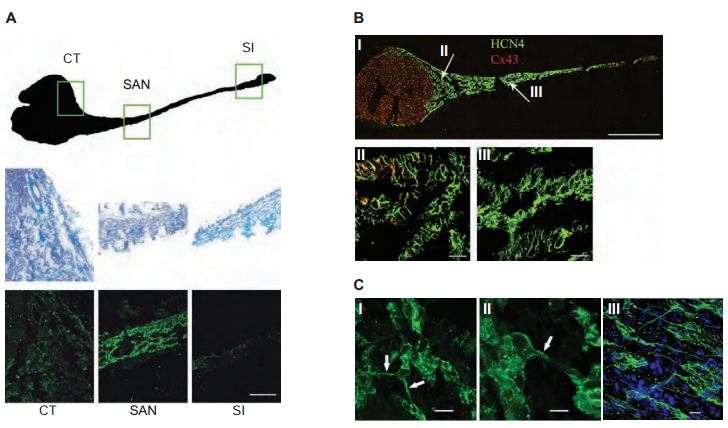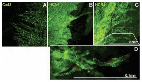 The distribution of HCN channels in the SAN was investigated using histology and immunolabeling applications. Anti-HCN1, Anti-HCN2 and Anti-HCN4 antibodies revealed that HCN4 is the only HCN isoform detectable in SAN cells. Strands of HCN4-positive nodal cells also protruded into the atrial muscle (Figure 3). The data suggest that this specialized interface between the SAN and the surrounding atrium may be necessary for the SAN to drive the more hyperpolarized atrial muscle21. In a different study, immunolabeling using Anti-HCN4 antibody demonstrated that the cells in the central SAN area are predominantly distributed in islets interconnected by cell prolongations (Figures 4A and 4B) and single-cell HCN4 labeling suggested sites of channel clustering (Figure 4C). It was therefore proposed that expression of HCN4 is an appropriate tool to map and identify the cardiac SAN pacemaker region9.