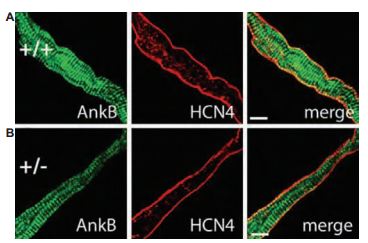 The genetic and molecular mechanisms underlying human sinus node dysfunction (SND) are limited. Penetrant and severe SND was mapped to the human ANK2 (ankyrin-B/AnkB) locus. AnkB is essential for normal membrane organization of SAN cell channels and transporters, and is also required for physiological cardiac pacing. Anti-HCN4 antibody was used as a SAN marker in immunohistochemistry in AnkB+/- and AnkB+/+ SAN cells from mouse sections (Figure 8). Their findings reveal abnormal channel targeting (but not HCN channels) with SND and highlight the critical role of local membrane organization for SAN excitability17.