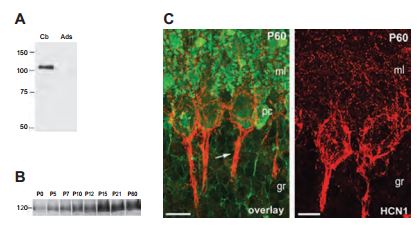 While all four HCN channels are expressed in the cerebellum, the contribution of the individual subunits to the proposed cerebellar functions of Ih is currently unknown. The presented study investigated the developmental profile, the selective distribution pattern and the cellular and subcellular localization of HCN1 in the cerebellum22 (Figure 2). Using Anti-HCN1, the authors found that HCN1 is indeed expressed in the rat cerebellum at P60 (postnatal day 60) (Figure 2A). In an attempt to study the expression of HCN1 during development, rat brain membranes were extracted (P0-P60) and subjected to western blot analysis. HCN1 expression became evident at P5 and peaked at P15 (Figure 2B). Confocal microscopy of immunohistochemical studies showed similar results and suggested that HCN1 is localized in axon terminals of cerebellar basket cells (Figure 2C). HCN1 expression is also developmentally regulated in the integrated compartments of the layer 5 pyramidal neurons as determined in immunohistochemical analysis using Anti-HCN15. HCN2 expression was also found to be developmentally regulated in the hippocampus using its respective Alomone Labs antibody48.