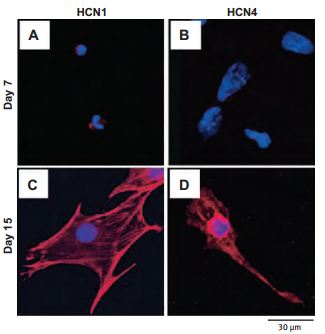 Cells from day 7 (A and B) and day 15 (C and D) of differentiation were sorted by FACS, then fixed and stained using Anti-HCN1 (A and C) and Anti-HCN4 (B and D) antibodies (#APC-056 and #APC-052, respectively) as indicated (red). Nuclei were stained using DAPI (blue).