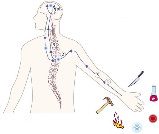 Pain can be generated by nociceptors from a number of stimuli including, heat, cold, mechanosensation, inflammation, injury and pH. Venom toxins intersect pain signaling by inhibiting or stimulating channels and receptors along the pathway. The possible localization of the pain pathway targets are illustrated above.