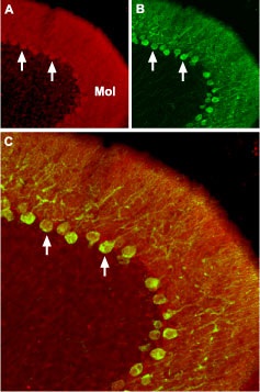 Immunohistochemical staining of CaV2.2 channel with Anti-CACNA1B (CaV2.2) Antibody (#ACC-002) in mouse cerebellum.A. CaV2.2 channel (red) appears in Purkinje cells (arrows) and is distributed diffusely in the molecular layer (Mol). B. staining of Purkinje nerve cells with mouse anti calcium binding protein (green) demonstrates the restriction of CaV2.2 to cell bodies but not to dendrites in the molecular layer. C. Confocal merge of CaV2.2 and CBD28K.