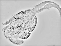 Staining of CaV1.3 in adult rat dorsal root ganglion (DRG) with Anti-CaV1.3 (CACNA1D) Antibody (#ACC-005). Staining (black) appeared mostly in clusters of cells (arrows) with variable intensity, within the ganglion; not in the roots.