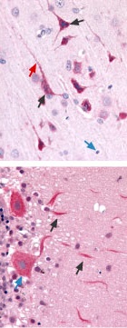 Immunohistochemical staining of CaV3.3 channel with Anti-CaV3.3 (CACNA1I) Antibody(#ACC-009) in in rat brain cortex and cerebellum. (A) Picture showing the third layer of the brain cortex. Pyramidal neurons cells (black arrow) and their axons (green arrow) shows strong staining. However, glial cells (blue arrows) show no staining at all. (B) Picture showing the Purkinje layer of the rat cerebellum. Note that Purkinje cells (blue arrows) and their axons (black arrows) were strongly stained. Staining product is red and counterstain is hematoxylin.