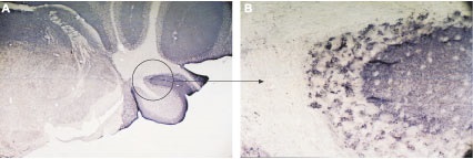 Immunohistochemical staining using Anti-VAMP-2 Antibody (#ANR-007) in mouse cerebellum (A). The entire molecular layer and patches of the granule layer were stained. The patchy pattern of staining is demonstrated in the circle shown in (A), magnified in (B).