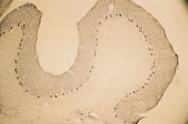 Immunohistochemical staining of Syntaxin 2 with Anti-Syntaxin 2 Antibody (#ANR-008) in the rat cerebellum. The soma of Purkinje cells are stained, as well as the upper layers of the cerebellum. Immunoreactive product is black.