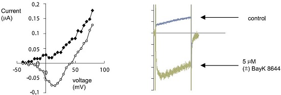The effect of 5 μM (±)-Bay K8644 (#B-350) on heterologously expressed L-type Ca2+ currents (CaV1.2 / α2δ1 / β2a, RNA injected into Xenopus oocytes). Left: I-V relation before (diamonds) and during (circles), bath perfusion of the compound. Right: Current response to 200 ms depolarization to +20 mV (from holding potential of -100 mV) before (blue) and during (green) perfusion of the drug.