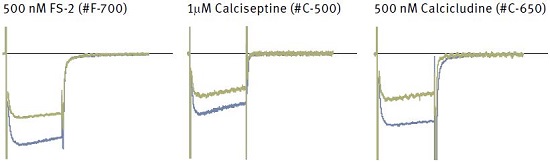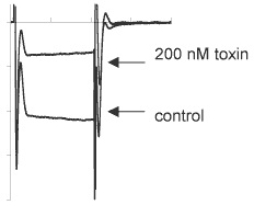 Inhibition of CaV2.2 channels expressed in Xenopus oocytes by ω-Conotoxin MVIIA (#C-670). Traces before or during perfusion of 200 nM toxin.