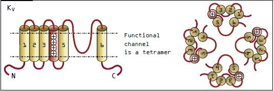 The KV α subunit is a protein with six transmembrane (TM) α helixes (TM1-6 or S1-6) and intracellular (cytoplasmatic) N- and C- termini. The most defined structural features are the extracellular loop between the fifth and sixth TM (which forms the K+ selectivity filter and the channel pore) and the fourth TM, which is positively charged and forms the voltage sensor of the protein (see Figure 2).