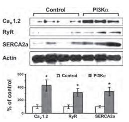 Although physiologically essential for normal cardiac function, increased level of CaV1.2 channels or activity have been implicated in pathological processesinvolving Ca2+ disturbance, including cardiac ischemia and myocardial stunning8. The expression level of CaV1.2 in the heart was demonstrated using Anti-CaV1.2 (CACNA1C) Antibody (#ACC-003) and its expression was up-regulated when PI3K and Ca2+/calmodulindependent protein kinase II (CamK II) were overexpressed9,10 (Figure 1).