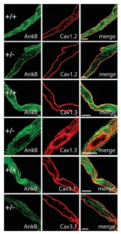 Confocal imaging of membrane distribution of voltage gated Ca2+channels in SAN cells of WT and Anykin B+/- transgenic mice was detected using Anti-CaV1.3 (CACNA1D) Antibody (#ACC-005), Anti-CaV1.2 (CACNA1C) Antibody (#ACC-003) and Anti-CACNA1G (CaV3.1) Antibody (#ACC-021).
