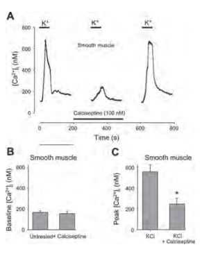 Ca2+ currents, through voltage-gated Ca2+ channels play a key role during excitation contraction coupling in smooth muscle cells (SMCs) of the vascular system. Using vascular smooth muscles cells, L-, P- and Q-type voltage-gated Ca2+ channels were found to be expressed using Anti-CACNA1A (CaV2.1) Antibody (#ACC-001) as well as Anti-CaV1.2 (CACNA1C) Antibody. Additional information about the identity of these channels was confirmed using Calciseptine (#SPC-500) known to inhibit the L-Type Ca2+ channels and ω-Agatoxin IVA (#STA-500) which inhibits P and Q-type Ca2+ channels14. Figure 3 shows smooth muscle cells treated with Calciseptine, showing that L-type Ca2+ channels are indeed involved Ca2+ currents in these cells15.