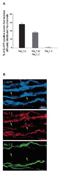 In another study, in order to understand the mechanisms and sequences responsible for targeting and localizing NaV1.2 tounmyelinatedaxons, chimeras between NaV1.2 and NaV1.6 were generated (NaV1.6 does not localize at unmyelinated axons). Results suggest that the 451 amino acids of NaV1.2 C-terminal are likely required for its interaction with neuron-specific factors in order to direct it to axons as tested using Anti-SCN2A (NaV1.2) Antibody19.