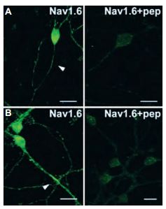 Demyelination can be repaired by remyelination in both humans and rodents, and even within the CNS. Congenitally dysmyelinated spinal cord axons can undergo remyelination, by transplanting adult neural precursor cells (aNPCs) from the brain of transgenic mice into the spinal cords of adult Shiverer (shi/shi) mice, which lack compact CNS myelin. Six weeks after transplantation, the transplanted aNPCs expressed oligodendrocyte markers, and formed compact myelin10. Anti-NaV1.6 (SCN8A) Antibody and Anti-SCN2A (NaV1.2) Antibody were both used to show that Na+ channels are not affected by dysmyelination. Specifically, the lack of immunoreactivity is as expected and that of NaV1.6 remains clustered at the nodes of Ranvier10. Similarly, glial cells, from olfactory ensheathing cells were transplanted into the demyelinated spinal cord and subsequently formed a compact myelin. Immunocytochemical analysis in remyelinated axons, with antibodies purchased from Alomone Labs, showed that NaV1.6 was clustered at nodes of Ranvier, whereas KV1.2 was aggregated in juxtaparanodal regions, recapitulating the distribution of these channels within mature nodes of uninjured axons. These findings indicate that, in addition to forming myelin, glial cell transplantion provides an environment that supports the development and maturation of nodes of Ranvier and the restoration of impulse conduction in central demyelinated axons24.