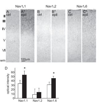 Immunostaining in control rats (no *) versus WAG/Rij rats (*) using Anti-SCN1A (NaV1.1) Antibody (#ASC-001), (A, A*), Anti-SCN2A (NaV1.2) Antibody (#ASC-002), (B, B*), and Anti-NaV1.6 (SCN8A) Antibody (#ASC-009), (C, C*). The control and epileptic images were digitally contrast-enhanced using identical parameters to qualitatively illustrate the up-regulation of the Na+ channels. D) Optical intensity quantification from unenhanced images of individual neurons in layers II-IV shows increased staining with Anti-SCN1A (NaV1.1) Antibody and Anti-NaV1.6 (SCN8A) Antibody in the epileptic animals (V) compared to controls (V), indicating up-regulated Na+ channel expression.