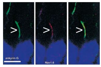 Another direction of research was done to investigate the mechanism for targeting and restricting voltage-gated Na+ channels to excitable membranes. It was proposed that one or more proteins colocalize with Na+ channels including βIV spectrin, ankyrin-G (ankyrin-3), and the L1 cell adhesion molecule (L1 CAM)14,15. Immunohistochemistry studies showed that ankyrin-G and IV spectrin appear at AIS by P2, whereas L1 CAM and NaV1.6 (using Alomone Labs’ antibody) are not fully assembled at continuous high density along AISs until P9. Furthermore,NaV1.6 and L1 CAM are not clustered in adult Purkinje neuron initial segments of mice lacking cerebellar ankyrin-G. These results support the conclusion that ankyrin-G coordinates the physiological assembly of voltage-gated Na+ channels, in AISs14. Similarities were found in the clustering of ankyrin-G, defining earlydevelopmental intermediates in the nodes of Ranvier formation in the mouse optic nerve14 (Figure 3).