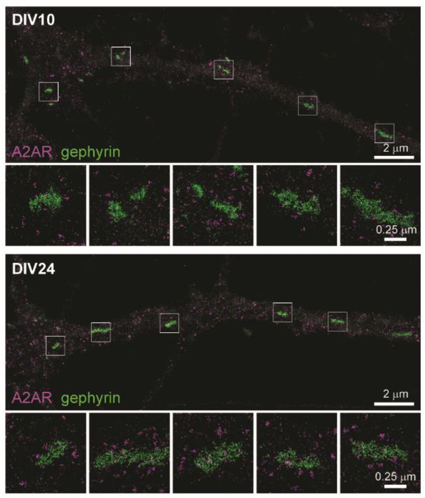 Using mouse hippocampus samples, Gomez et al. used electron microscopy to show postsynaptic localization of A2ARs with what they presumed to be GABAergic synapses. To confirm this result, they used DNA-PAINT with our Anti-Adenosine A2A Receptor Antibody (#AAR-002) to clearly show that A2ARs were indeed positioned close to GABAergic post-synapse, (which they identified by the presence of gephyrin – a scaffolding molecule). These data, along with western blot and quantification of DNA-PAINT, revealed an increased density of postsynaptic A2ARs during the peak of synaptogenesis.