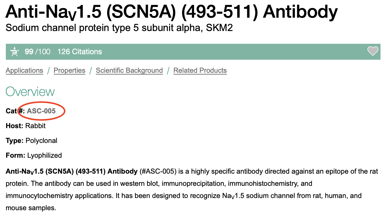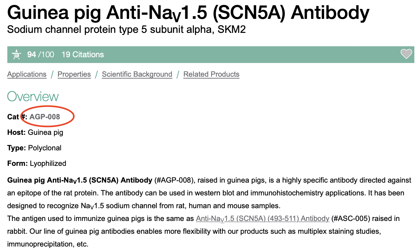 Take the rabbit Anti-NaV1.5 (SCN5A) Antibody for example. This rabbit antibody has the catalog number #ASC-005 but the guinea pig version is #AGP-008. That doesn’t really make sense: the prefix changes and the code number changes but all that’s different is the host.