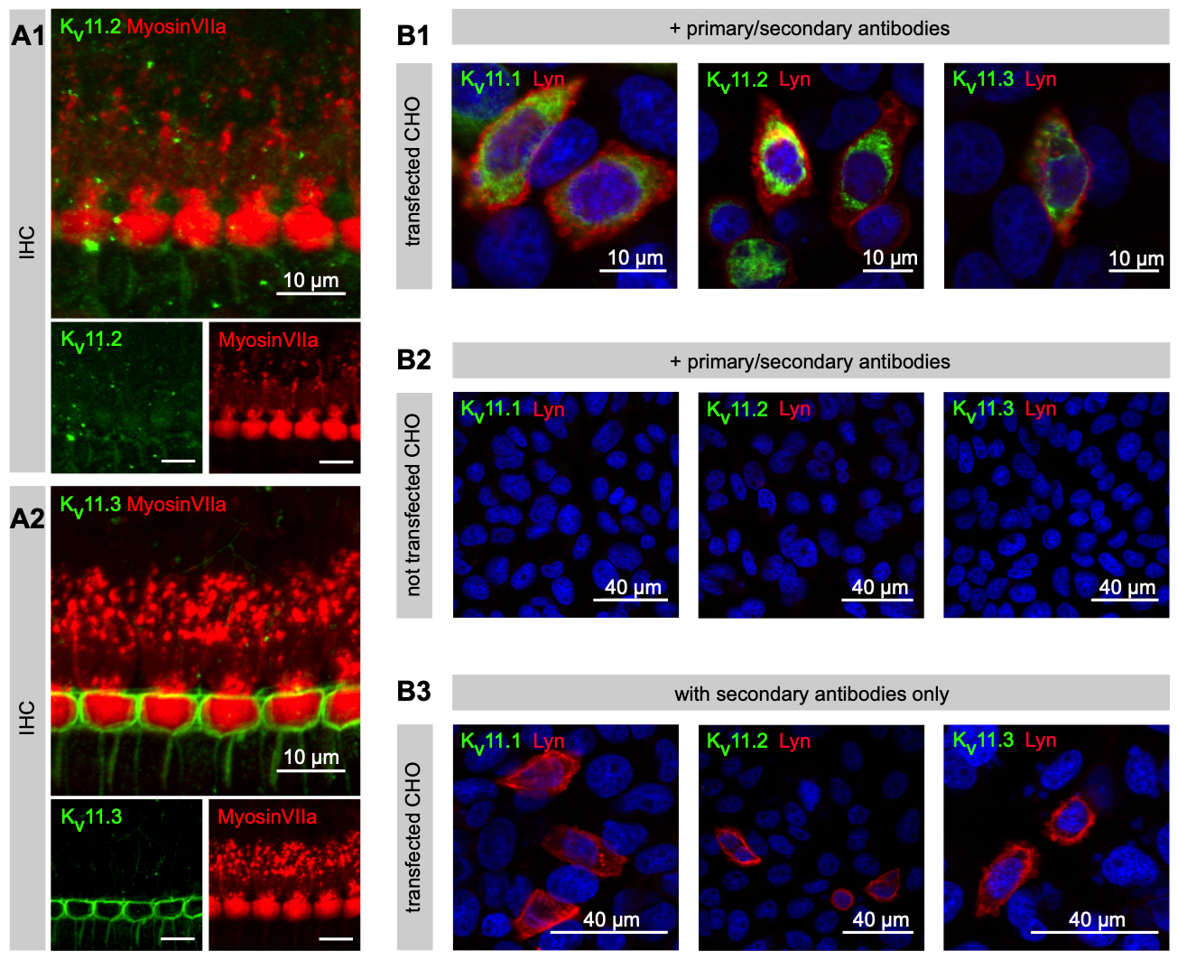The team relied on RT-PCR and fluorescent immunohistochemistry to demonstrate the expression of Kv11.1 (via #APC-016), Kv11.2 (via #APC-114), and Kv11.3 channels in cochlear lysates and cells (Figure 1).