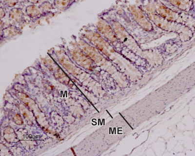 Figure 3: Expression of OX1R in rat colon. Immunohistochemical staining of paraffin-embedded longitudinal section of rat colon showing mucosa (M), submucosa (SM), and muscularis externa (ME) using Anti-Orexin Receptor 1 Antibody (#AOR-001), (1:100). Note that the stain (red-brown color) is highly specific for absorptive cells in the superior third of the intestinal glands. Immunolabeling was detected using DAB as the chromogen and hematoxylin as the counterstain.