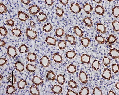 Figure 1: Expression of AQP2 in rat kidney. Immunohistochemical staining of rat kidney paraffin embedded section showing the inner medulla using Anti-Aquaporin 2 Antibody (#AQP-002), (1:100). Intense stain (brown color) is present in collecting ducts but not in thin segments of the loop of Henle. Hematoxylin is used as the counterstain.