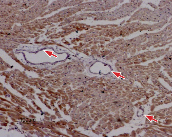 Figure 2: Expression of RyR2 in rat cardiac muscle. Immunohistochemical staining of paraffin-embedded sections of rat myocardium using Anti-Ryanodine Receptor 2 Antibody (#ARR-002), (1:50). Staining is specific for cardiomyocytes while smooth muscles cells in the artery walls are negative (red arrows). Hematoxylin is used as the counterstain.