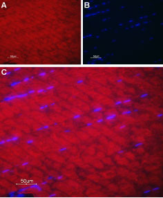 Figure 4: Expression of SERCA1 in rat skeletal muscle. Immunohistochemical staining of rat skeletal muscle paraffin-embedded sections using Anti-SERCA1 Antibody (#ACP-011), followed by goat anti-rabbit-AlexaFluor-594 secondary antibody. A. SERCA1 labeling appears in the muscle fibers, in a pattern that could indicate the location of the sarcoplasmic reticulum. The endomysium, surrounding muscle fibers, is not stained. B. Nuclear staining using DAPI as the counterstain. C. Merged image of A and B.
