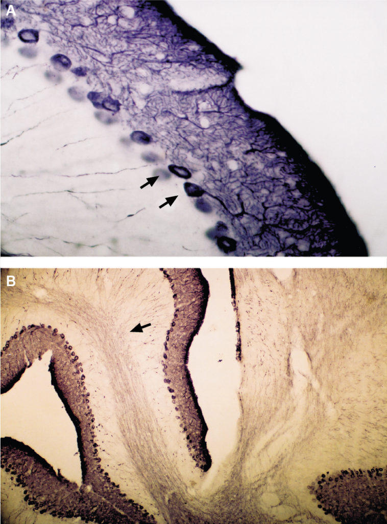 Expression of IP3 receptor 1 in mouse cerebellum. Immunohistochemical staining of mouse cerebellum with Anti-IP3 Receptor-1 (ITPR1) Antibody (ACC-019). A) Immunoreactivity appeared in Purkinje cells (indicated with arrows) and their dendritic trees. B) Axonal processes coursing through cerebellar white matter were visualized (shown by the arrow).