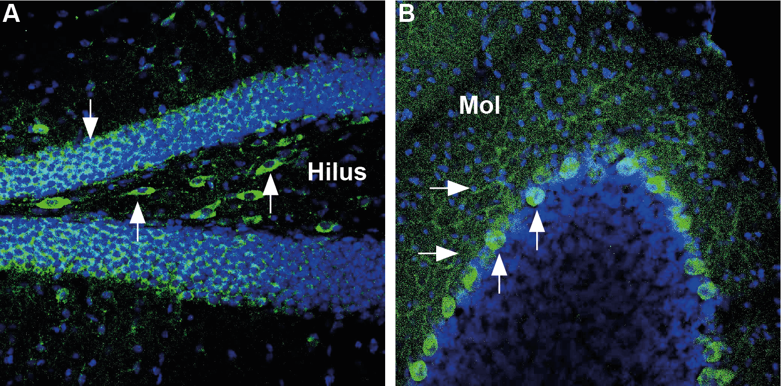 Glucose transporter 3 (GLUT3) expression in the murine hippocampus and cerebellum. Immunohistochemical staining of perfusion-fixed frozen mouse brain sections with Anti-GLUT3 (extracellular) Antibody (AGT-023) (1:200) and goat anti-rabbit Alexa Fluor 488. A) GLUT3 staining (green) in the mouse hippocampal dentate gyrus is detected in interneurons (arrows pointing up) in the hilus and granule layer arrow pointing down). The cell nuclei are stained with DAPI (blue). B) GLUT3 staining (green) in the mouse cerebellum is observed in Purkinje cells (vertical arrows) and dendrites (horizontal arrows) in the molecular layer (Mol). The cell nuclei are stained with DAPI (blue).