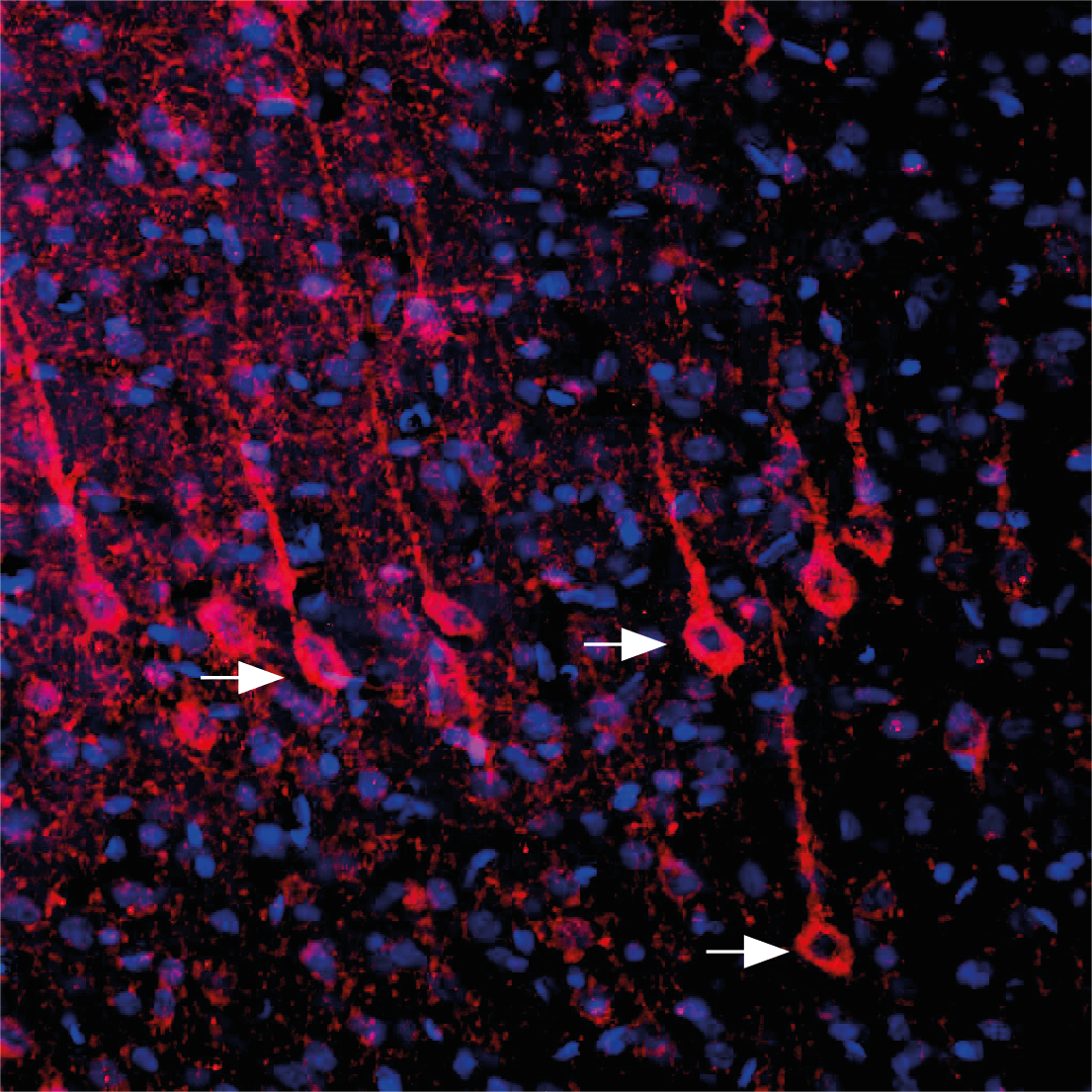 P2RY6 expression in the rat parietal cortex. Immunohistochemical staining of perfusion-fixed frozen rat brain sections with Anti-P2Y6 Receptor (extracellular) Antibody (APR-106) (1:1,000), donkey anti-rabbit biotin-conjugated antibody, and streptavidin-Cy3. P2RY6 immunoreactivity (red) appeared in the pyramidal neurons (arrows). The cell nuclei are stained with DAPI (blue).