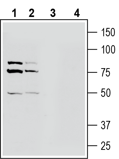 WB analysis of mouse brain membranes (lanes 1 and 3) and rat brain membranes (lanes 2 and 4).