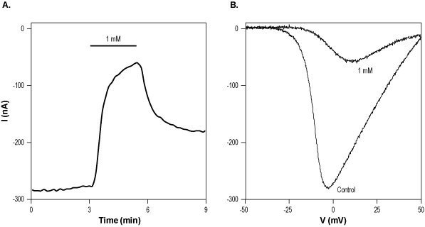 Alomone Labs (±)-Naringenin inhibits L-type CaV currents expressed in Xenopus oocytes.A. Time course of CaV1.2/α2-δ1/β1 current inhibition by 1 mM (±)-Naringenin (#N-110). Currents were elicited by application of voltage ramps from a holding potential of -100 mV to +50 mV (100 msec). B. Superimposed example traces of current responses before and during perfusion of 1 mM (±)-Naringenin as indicated.